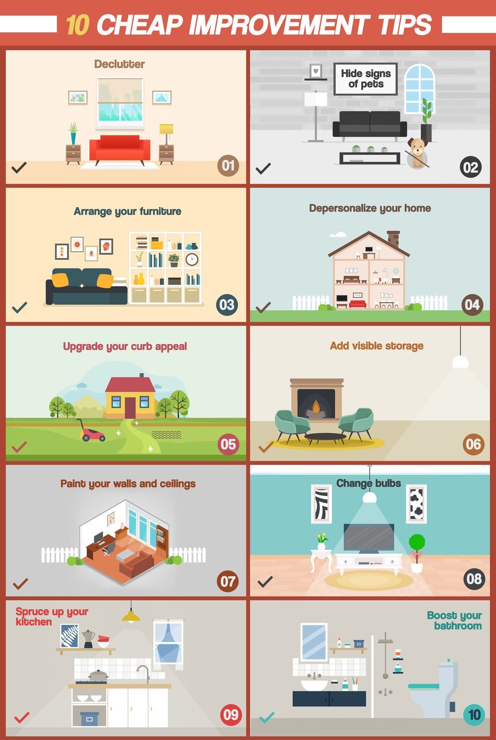 You might be dreading the idea of improving your home because it might cost you a fortune. Don't fret! This list will enlighten you that simple and easy measures which you can do yourself will make a big (and positive!) difference in your home. You can ask your agent how to stage your home best, but it won’t hurt to get a headstart on making your home as presentable as it may be – without having to spend thousands of dollars.